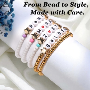 Lovely bracelet set. The photos show more of the letters of the names blocked out with shapes, there’s a reason for that. But in person only one vowel from each name is replaced with a shape so you can more easily tell what the names are. The quality is good, nice white and gold colour scheme. Good stretch.