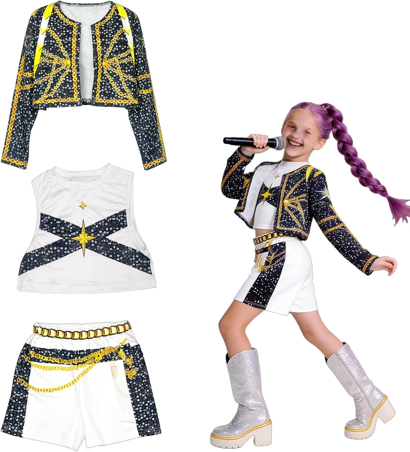 Ce costume reproduit avec précision la tenue portée par Rumi lors de ses performances scéniques. Il comprend une veste jaune éclatante, un débardeur ajusté et un short stylisé, reflétant le style audacieux et dynamique du personnage. Les détails, tels que les épaulettes et les accessoires métalliques, ajoutent une touche authentique, permettant à votre enfant de se sentir comme une véritable star de la K-pop.