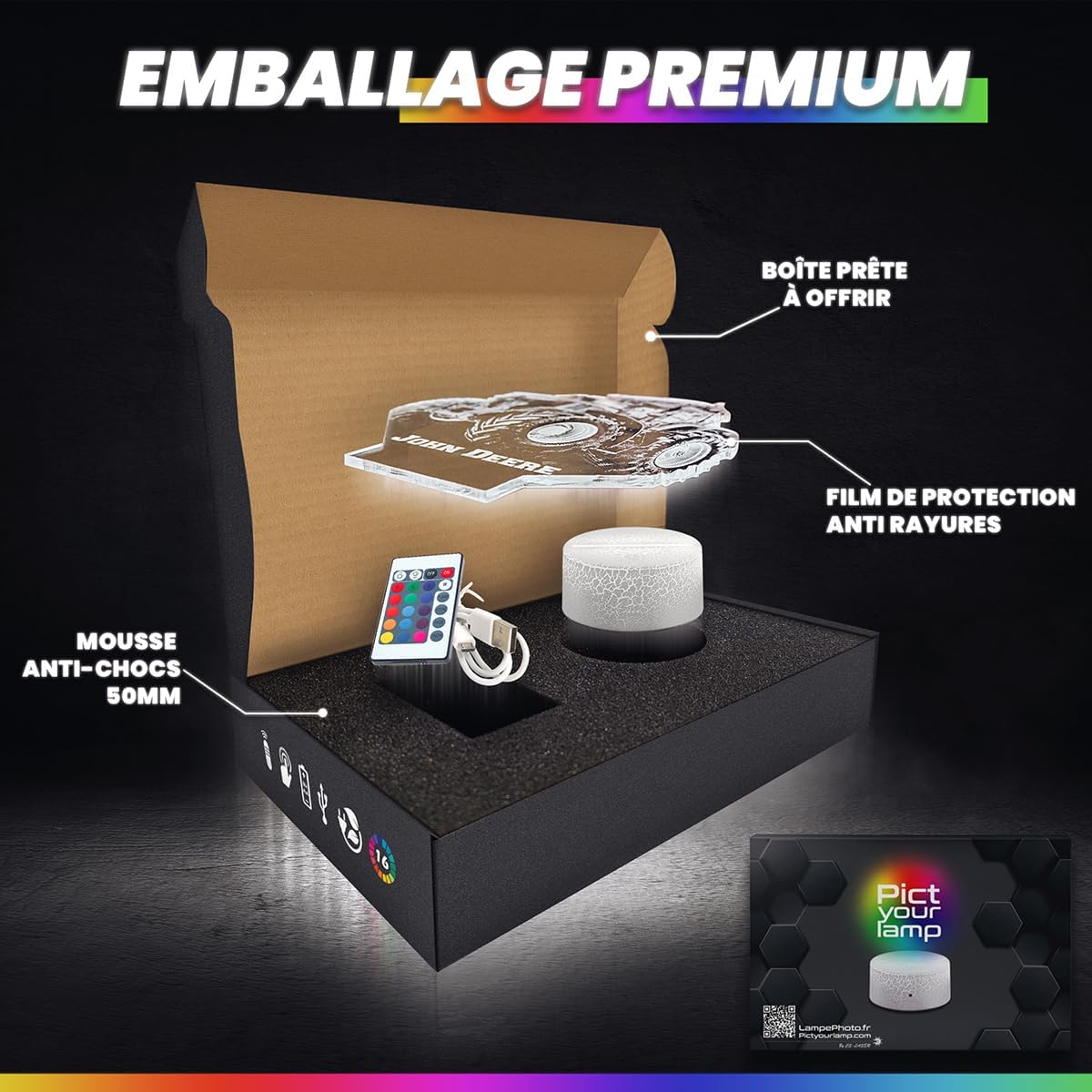 - Socle Noir LED 7 couleurs tactile avec télécommande : Permet de choisir parmi 7 couleurs différentes pour adapter l’ambiance à votre humeur.
