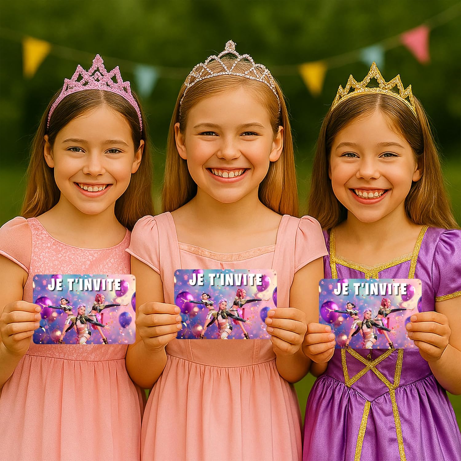Bien que le design soit inspiré des héroïnes du film, les invitations conviennent à tous les enfants passionnés par l’univers de « KPop Demon Hunters » et la danse.