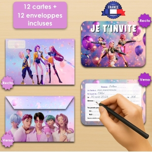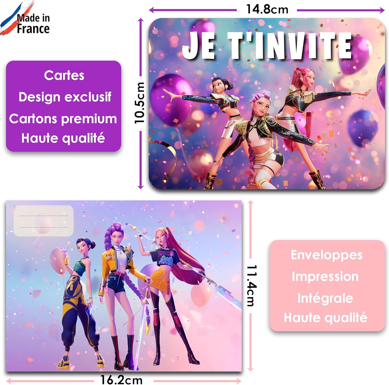 Plongez dans l’univers envoûtant de « KPop Demon Hunters » avec ce pack de 12 invitations d’anniversaire sur le thème de la danse, accompagné d’enveloppes assorties. Parfait pour les enfants et les jeunes filles, ce set pré-rempli en français est idéal pour organiser une fête d’anniversaire ou un goûter inspiré du film à succès disponible sur Netflix.